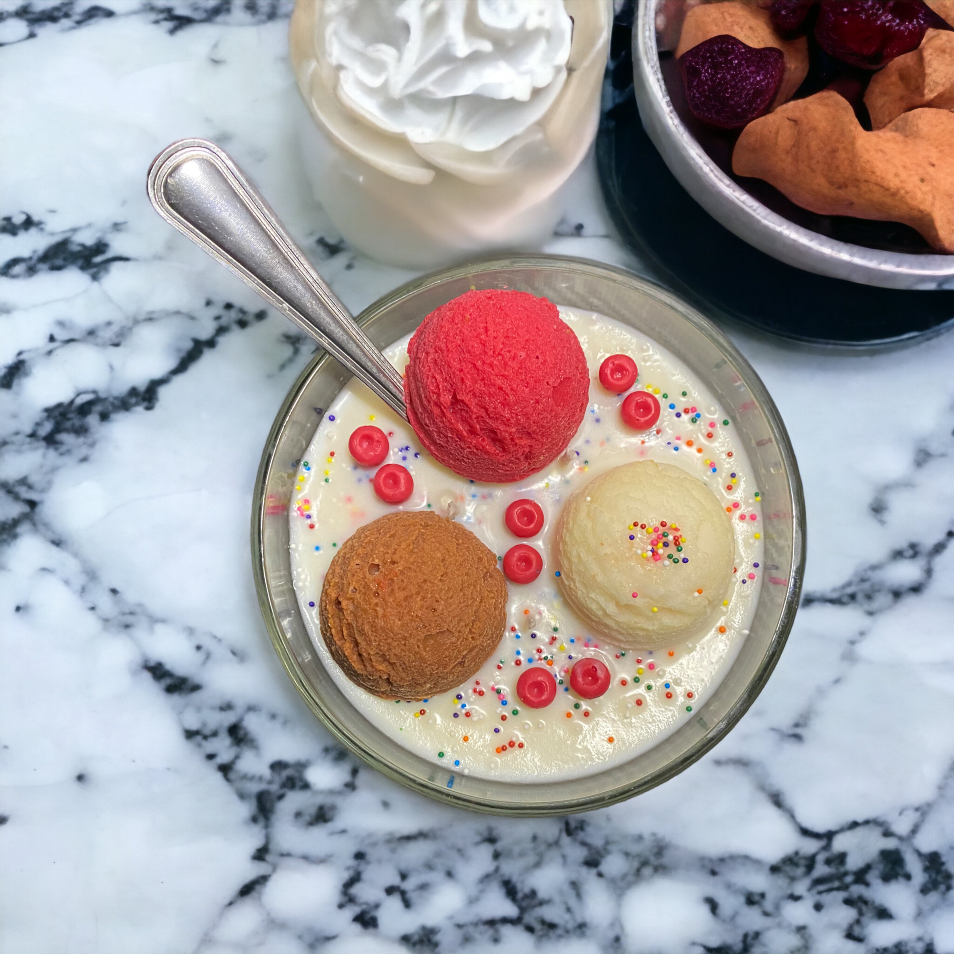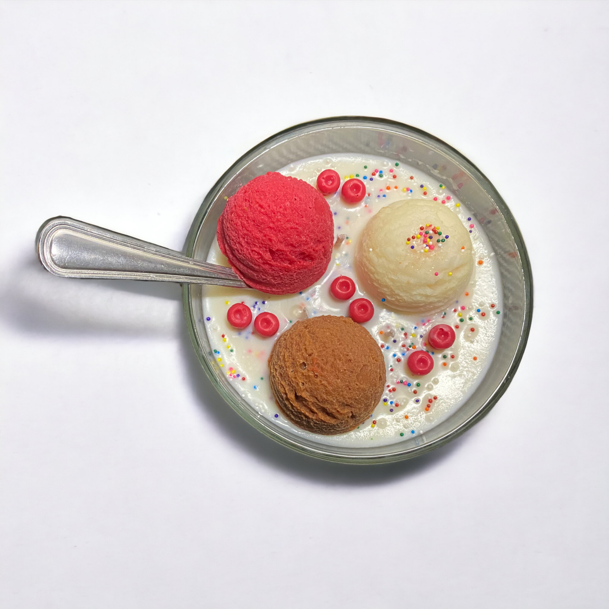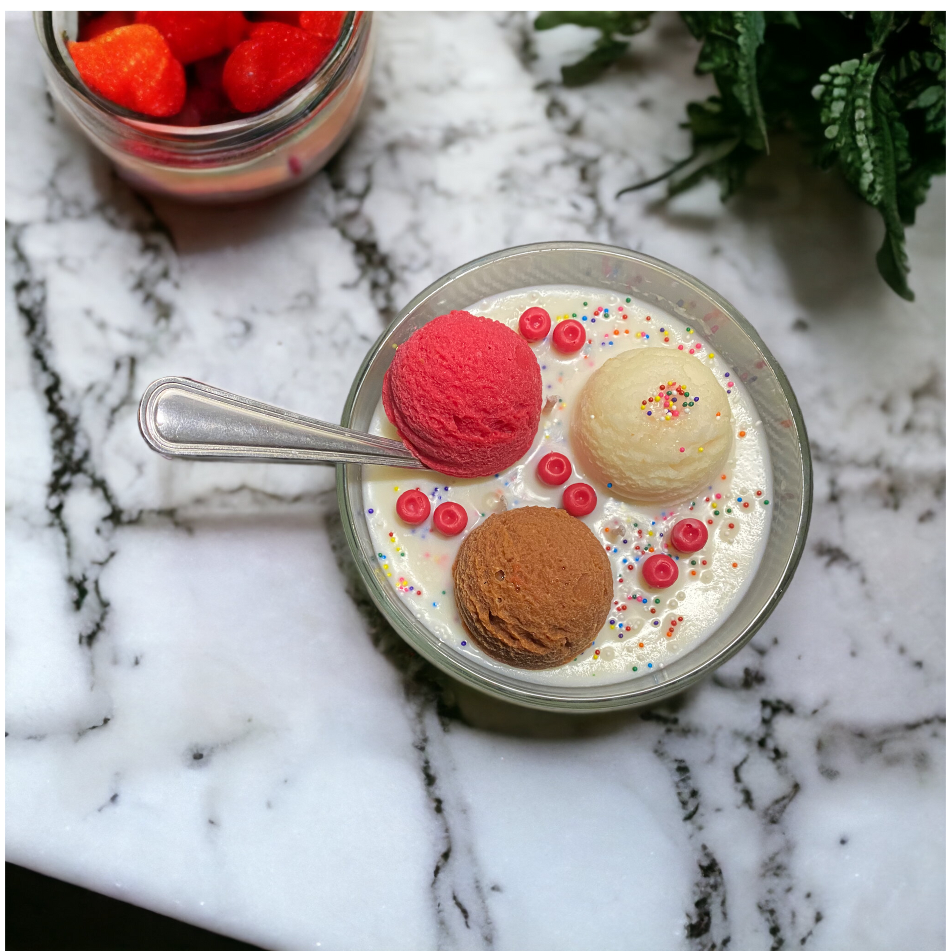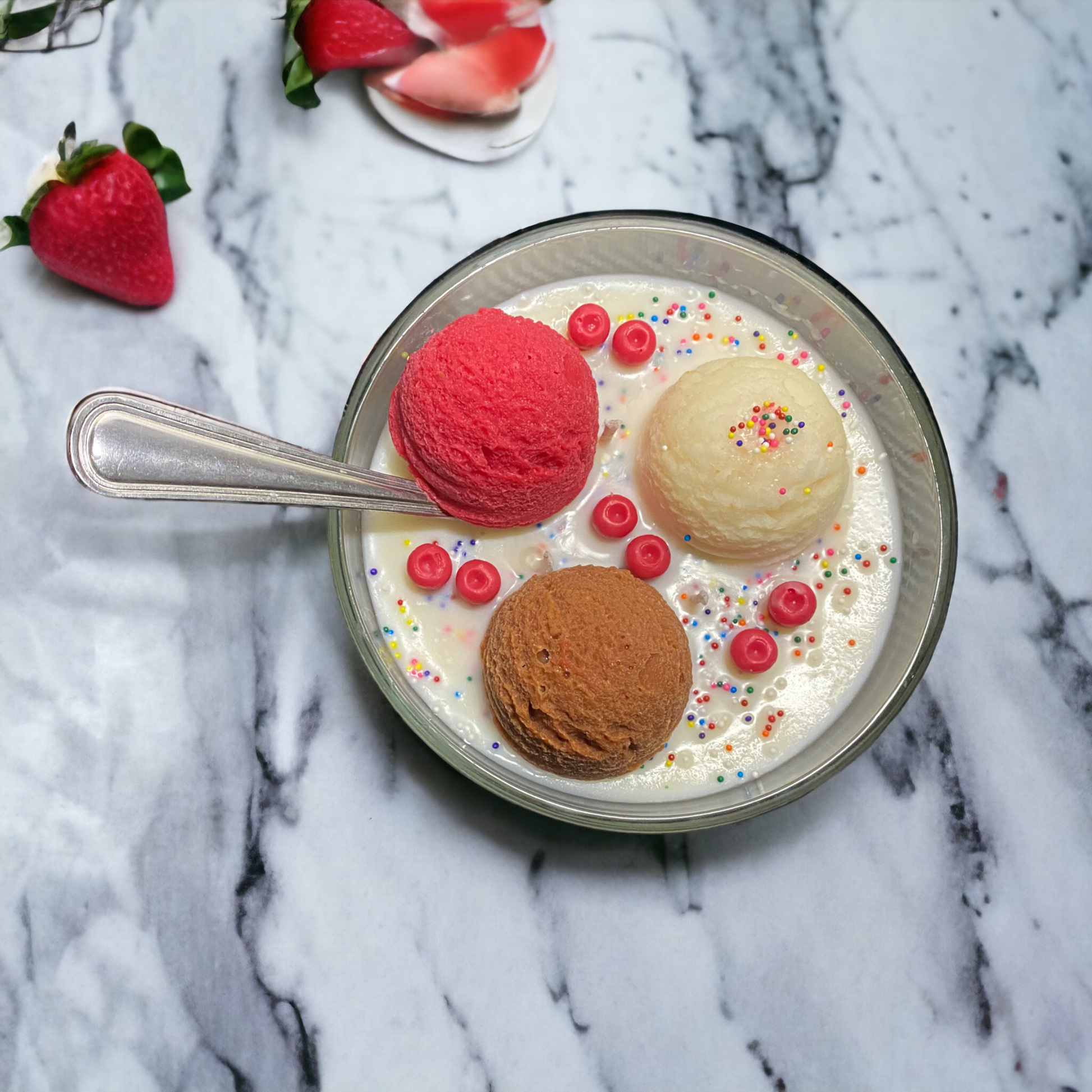 Crafter to resemble a delectable bowl of ice cream scoops, this candle adds a touch of whimsy to any space. As you light the three wicks, watch the wax "scoop" transform into a pool of gentle, flickering light, creating an ambiance reminiscent of your favorite ice cream parlor. Whether it's velvety vanilla, rich chocolate, strawberry, or a burst of fruity fun, each bowl is carefully scented to evoke memories of sweet indulgence.