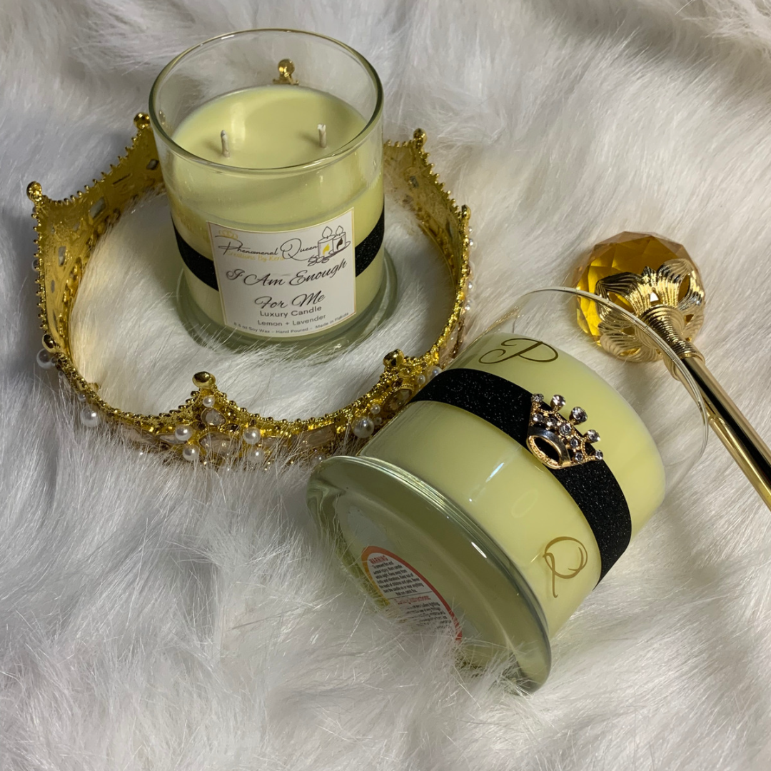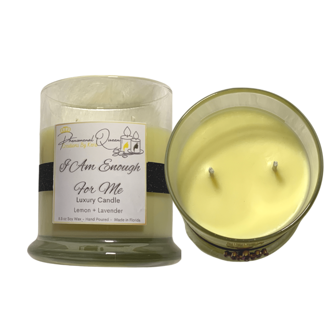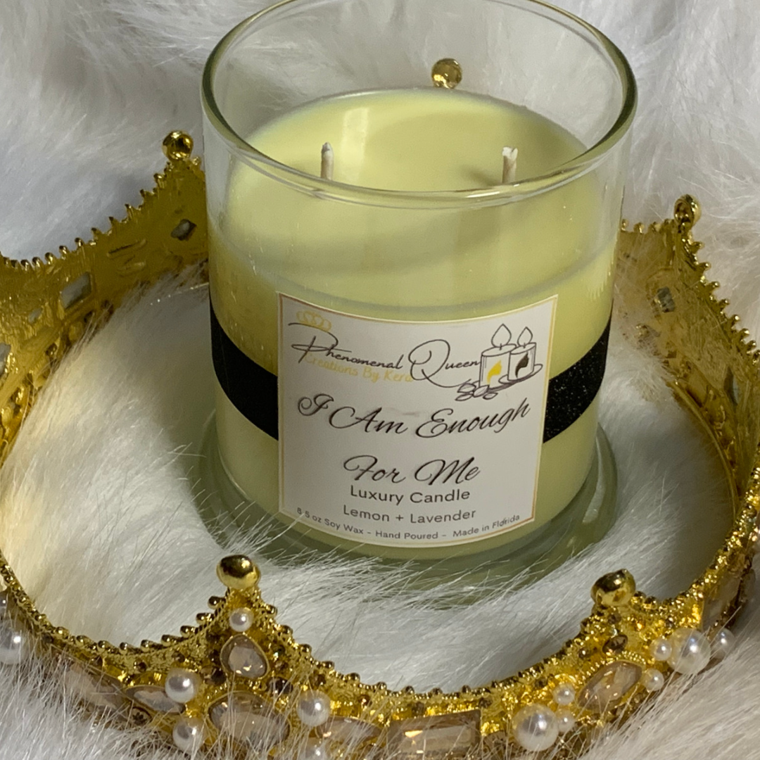 I Am Enough For Me is our 11.5oz signature candle from our Luxury Collection. The scents used to make this beauty are Lemon and Lavender.