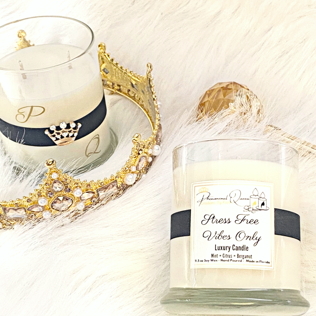 Stress Free Vibes Only is our 11.5oz signature candle from our Luxury Collection. The scents used to make this beauty are Mint, Citrus, and Bergamot.